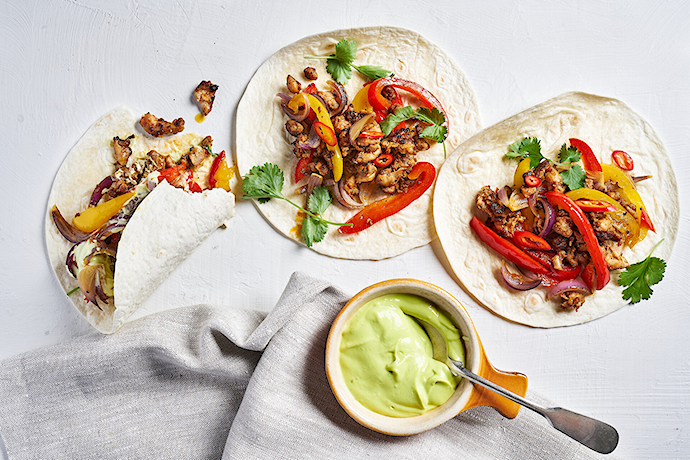 - Lämmitä tortillaletut uunissa tai mikrossa ja täytä paprika-sipulipaistoksella, fajitas-suikaleilla, avokado crème fraîchella sekä korianterilla.